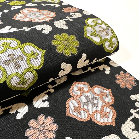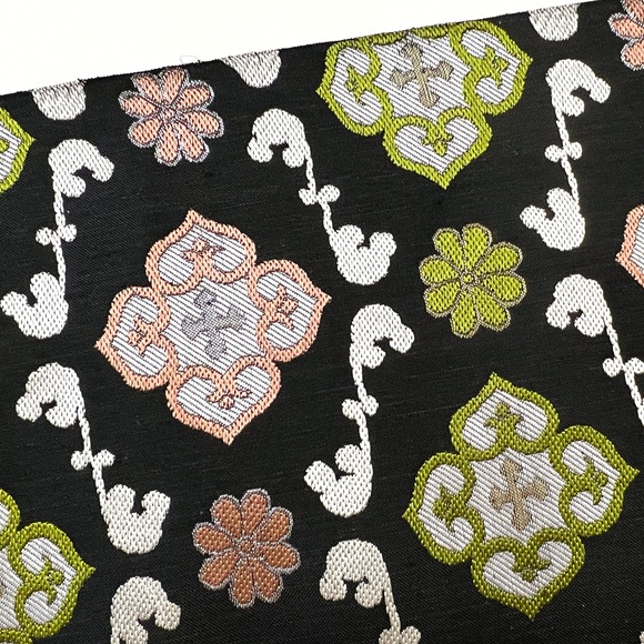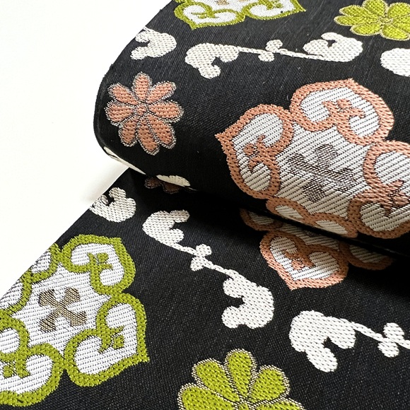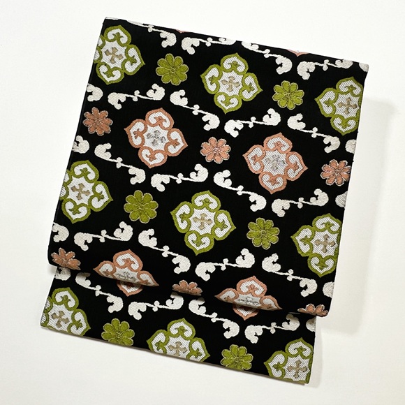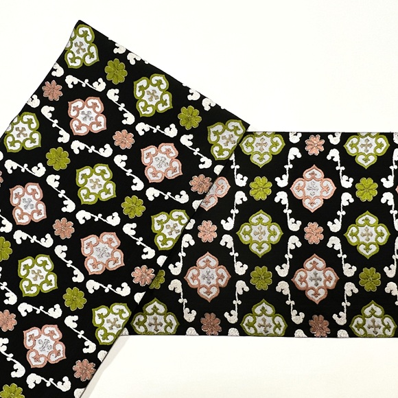 黒地に鶸萌黄・鴇浅葱・灰白の配色は小袖などに使われた日本的な配色で、お洒落着物に合わせる帯としてお使いいただけます。