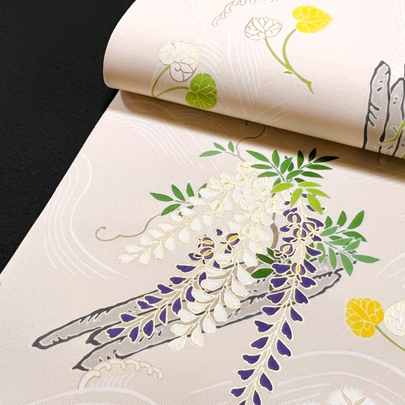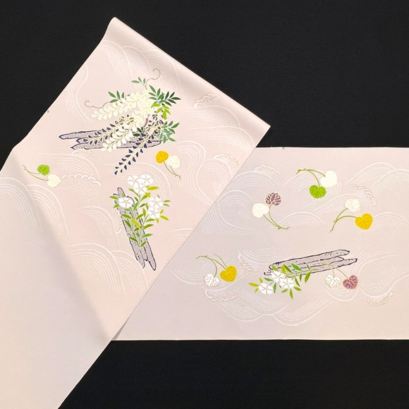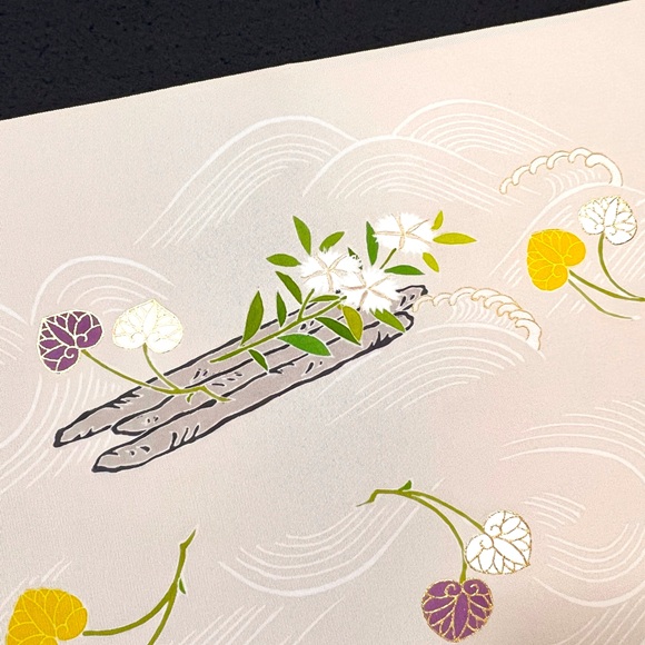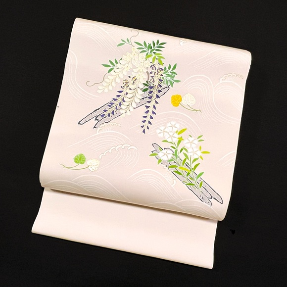 白上げの波に流れる筏に「藤」「撫子」「葵」が描かれており、京都の風雅さを表現する素敵な手描きのお洒落帯でございます。