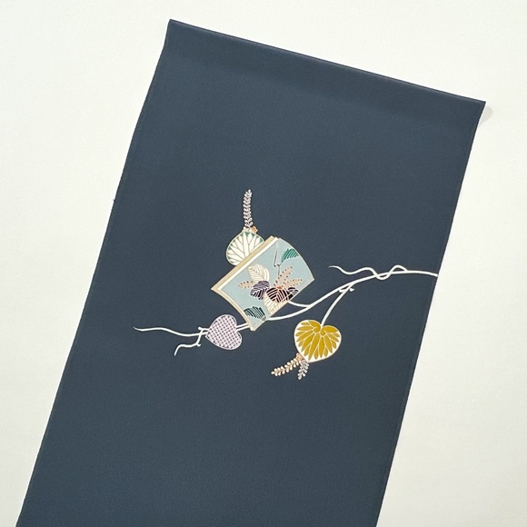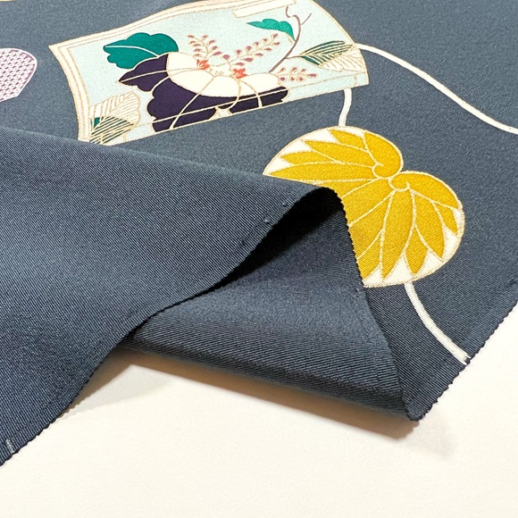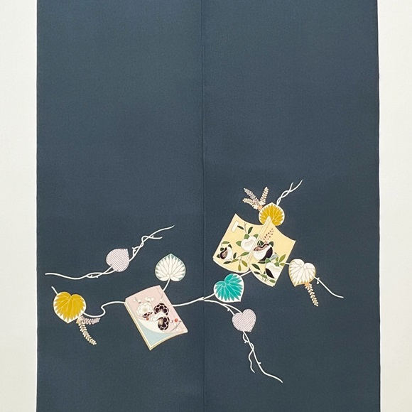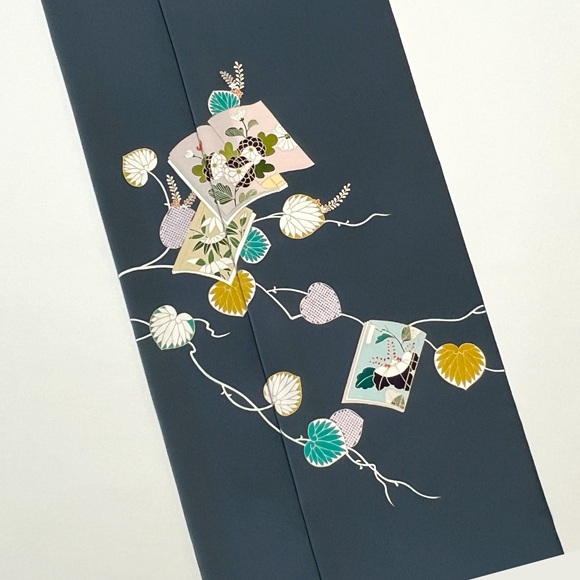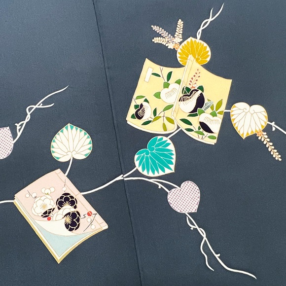 手描きと染疋田で表された葵文様、そして冊子文の中には「菊」「桐」「橘」「笹」「梅」が桃山調に描かれております。