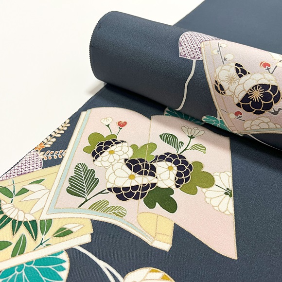 金で縁取られた草花や本の文様は、工芸キモノ野口ならではの配色で表現され、古典文様なのに個性的で新しさを感じさせてくれます。