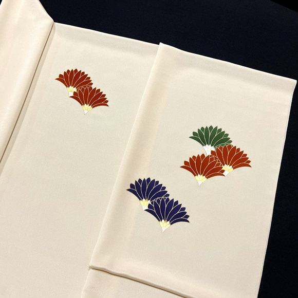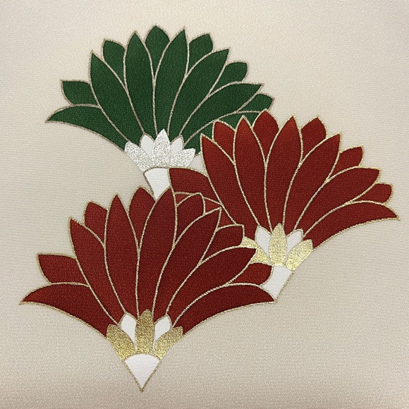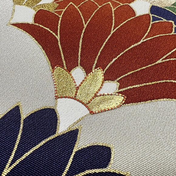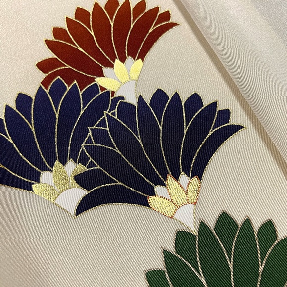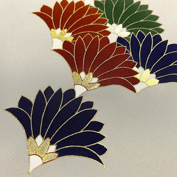 金で縁取られた濃い紺、茶、緑の菊文様は、花びら下の中心部分に金箔・銀箔、そして上前部分のみ金駒刺繍を入れ華やかさも表現しております。
