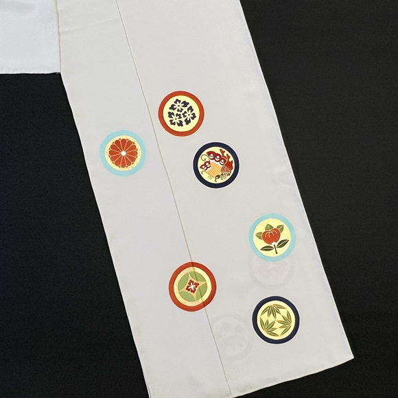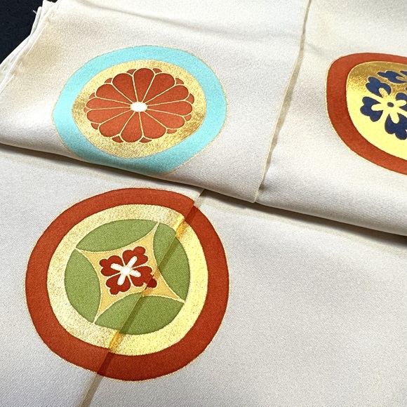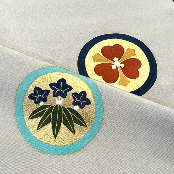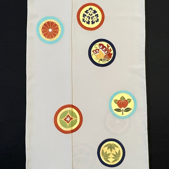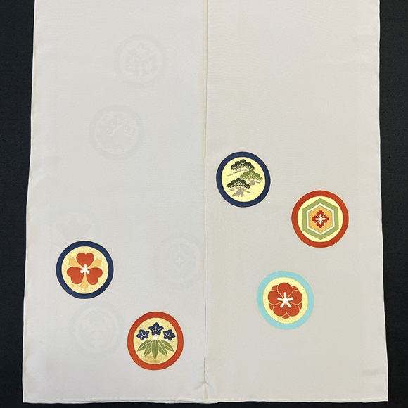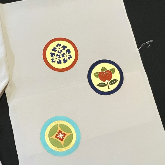 丸の中に草花や蝶、七宝文などの古典文様を手描きと箔で表現しております。