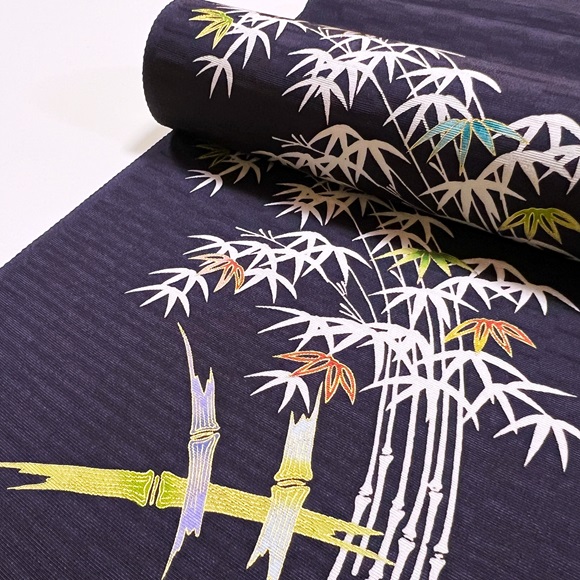弊社ではお馴染みの上質な影織の生地を濃紫色に染め、笹にふくら雀を表した小紋です。