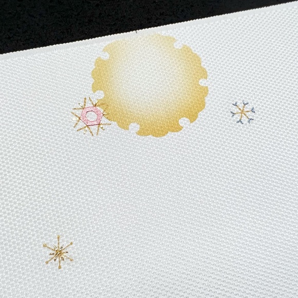 伊と幸の「石目」と言う白生地に金砂子で雪輪文様を表し、手刺繡で雪の結晶を散らした名古屋帯です。