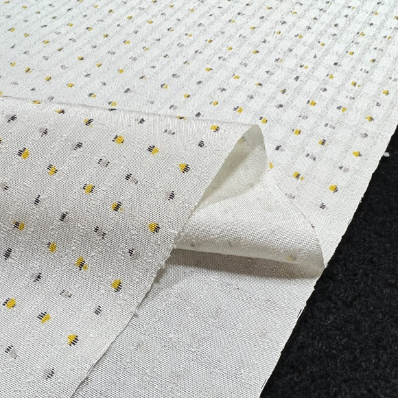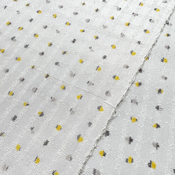 小千谷紬のリング格子地に黄色とグレーの点描きを染めたモダンな小紋です。