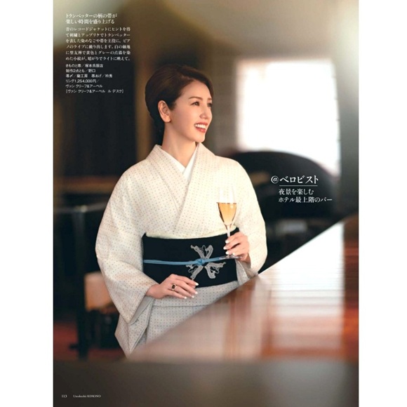 美しいキモノ2025春号でモデルの美香さんの着こなしで掲載しております「小千谷格子点描き小紋」