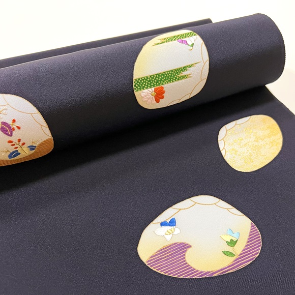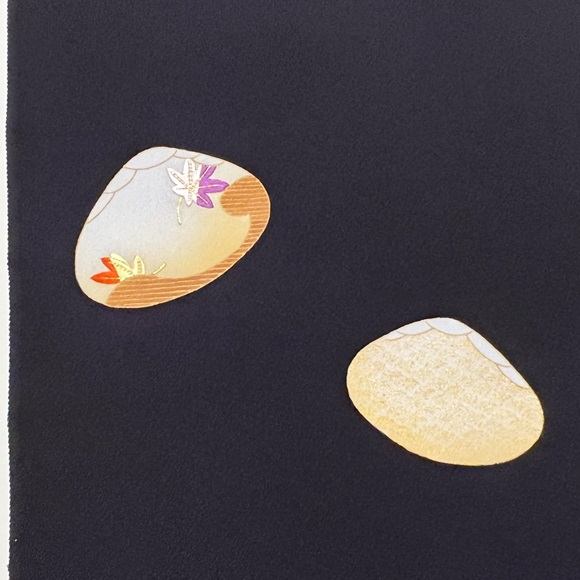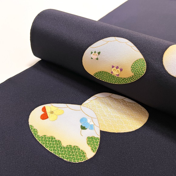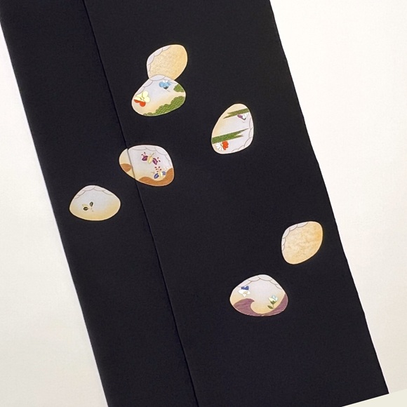 源氏貝取りの中にはヱ霞や青海波、桐や菊等の草花文様などを見事な染めと手刺繍、金彩で表しております。