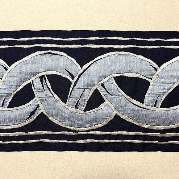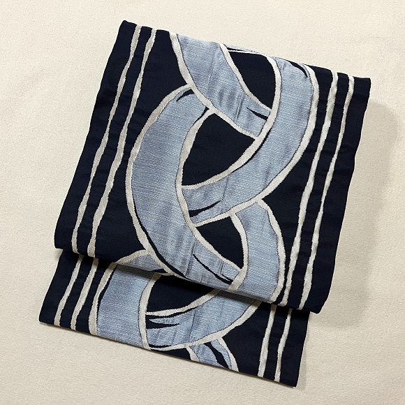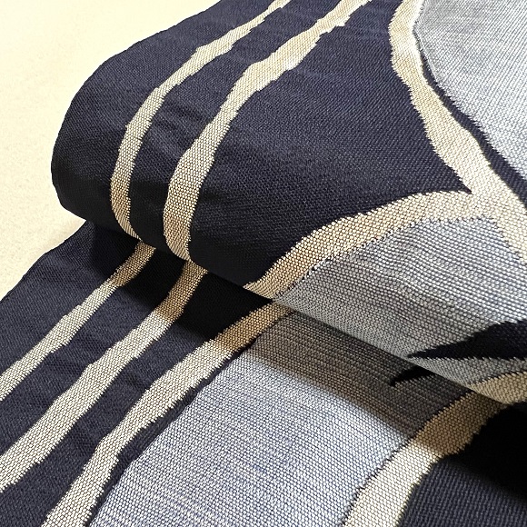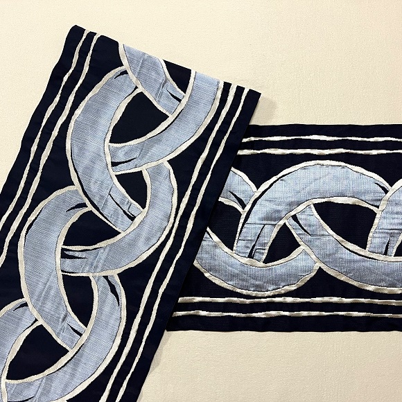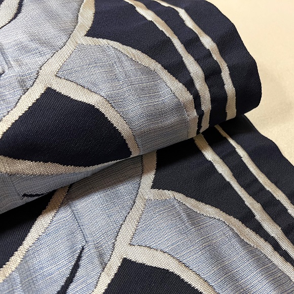 今回の紺地にシルバーとブルーの配色は、洛風林らしい個性的でダイナミックなイコンダール立涌の名古屋帯に織り上げられていると思います。