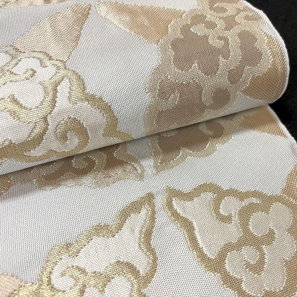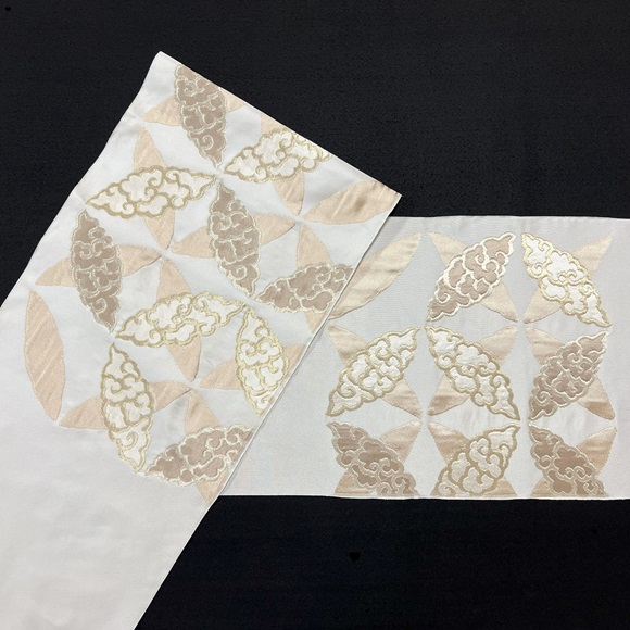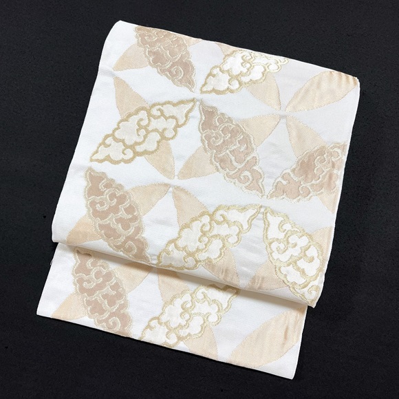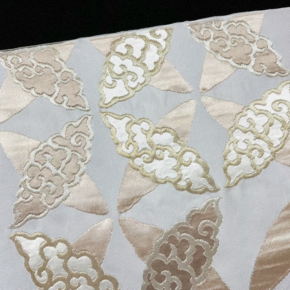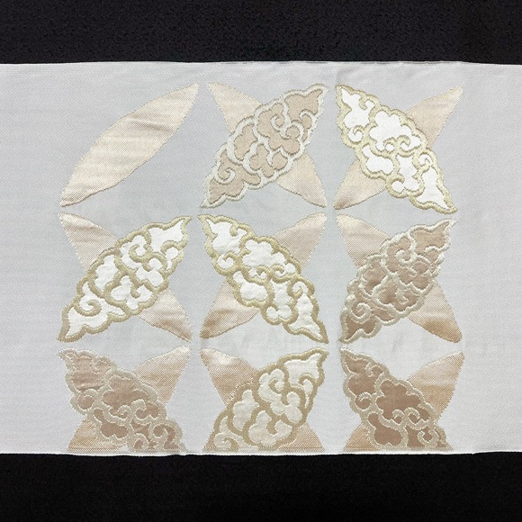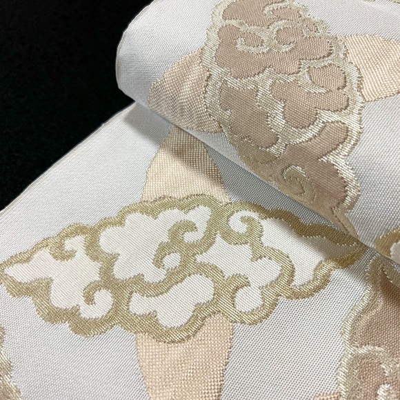白銀地に膨れ織りの技法で白茶の濃淡、そして落ち着いた金・銀で雲七宝を表現されております。