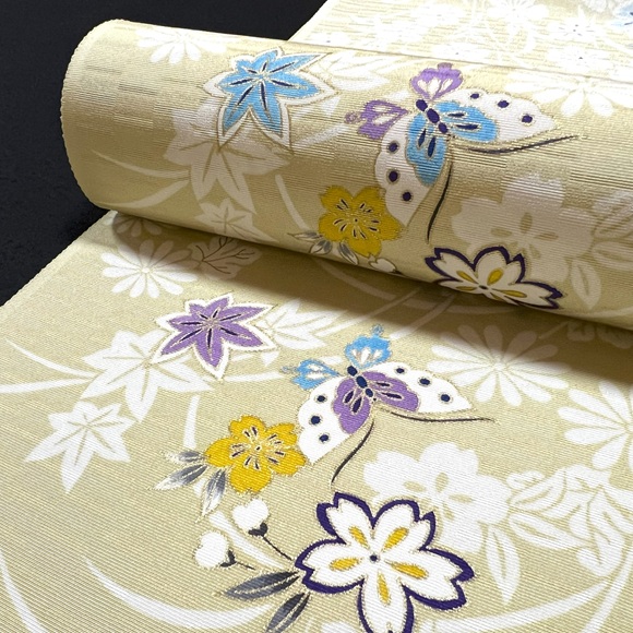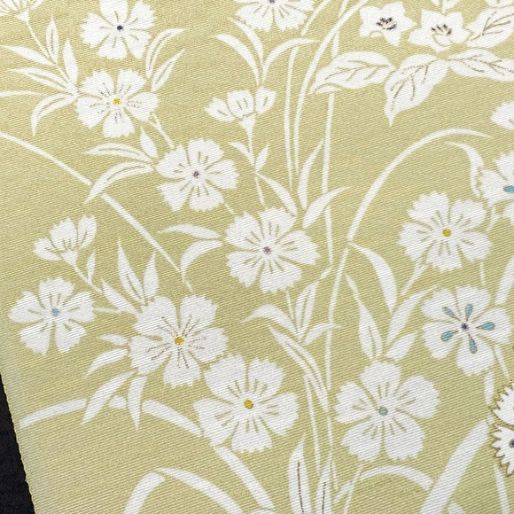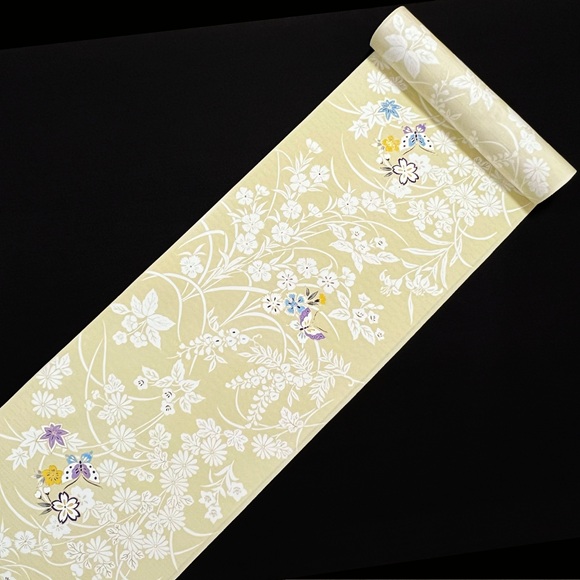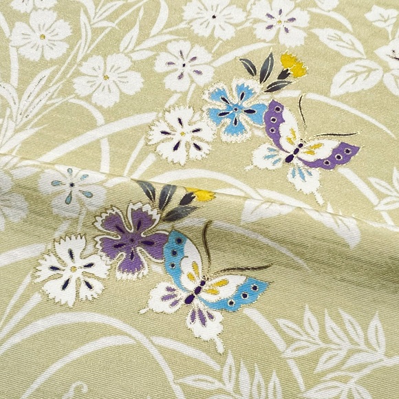 上質な影織り地を薄柳色(薄黄緑色)に染め、総柄の草花に舞う蝶を表した小紋です。