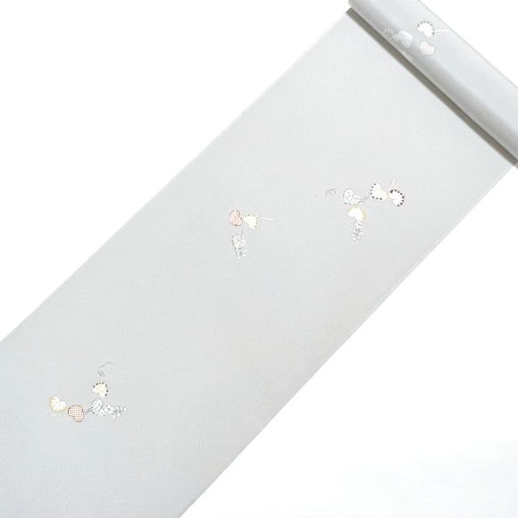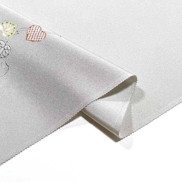 上質な白生地「凛」を薄鼠色に染め、枝葵の柄を散らした小紋です。