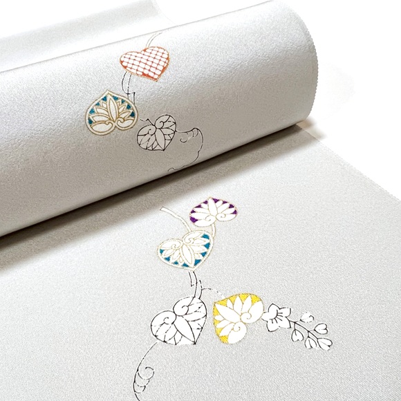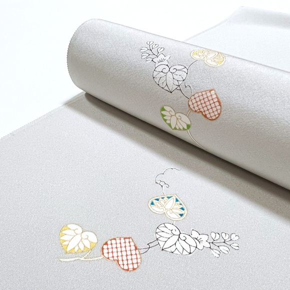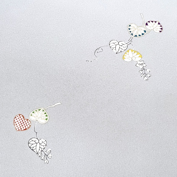 落ち着いた薄鼠の地色に、工芸キモノ野口ならではの配色で葵模様を表現しております。
