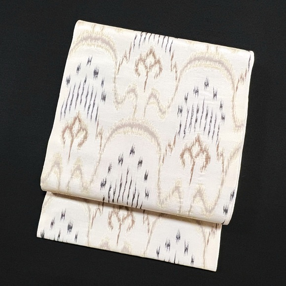 白よごし地に淡い配色で表現されたこの名古屋帯は、品よく洗練された美しさがあり、落ち着いた大人の着こなしに最適です。