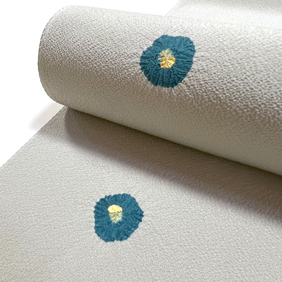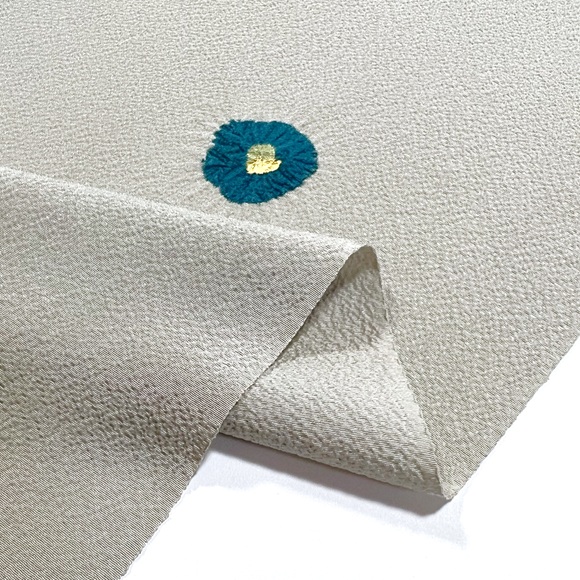 少ししぼの高い上質なちりめんの白生地を薄鼠色に染め、絞りで椿を表した小紋です。