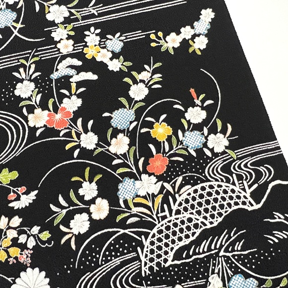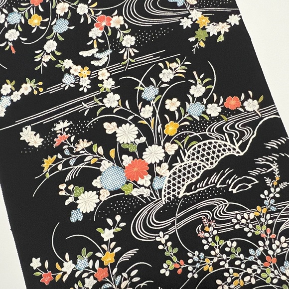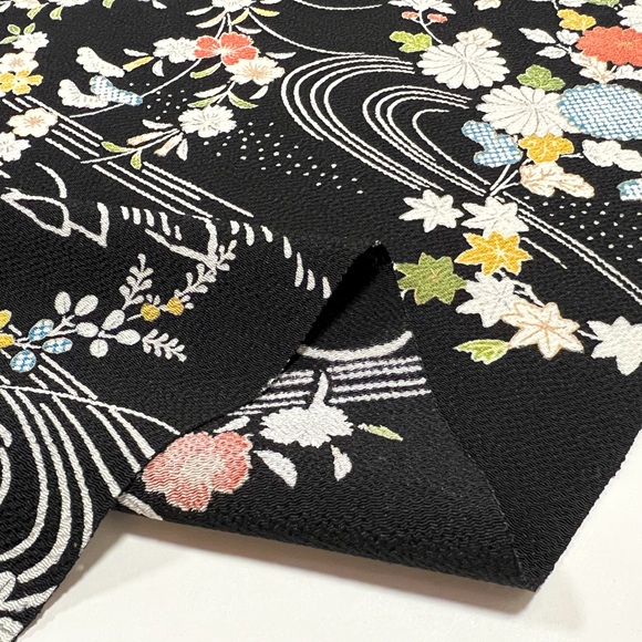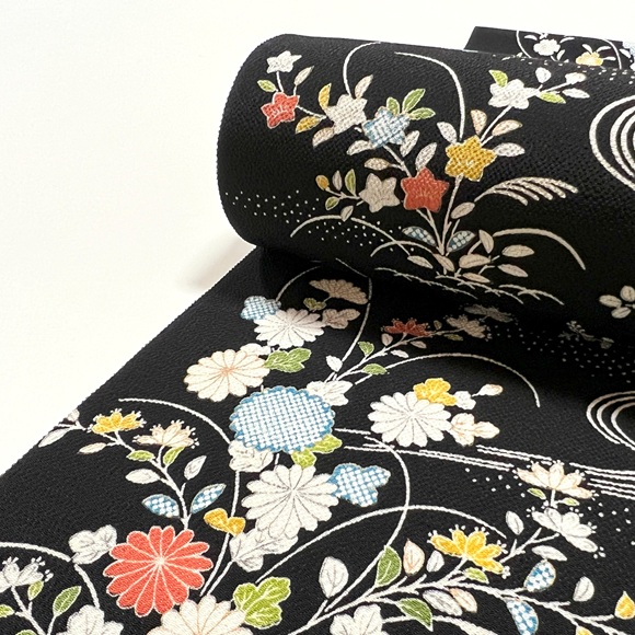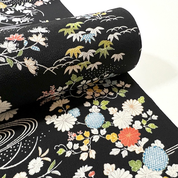 上質な長浜の鬼しぼちりめんを黒色に染め、御所解き文様を表した小紋です。