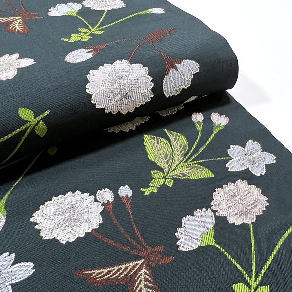桜の帯と言うと、はんなりした可愛らしいイメージの物が多いのですが、今回の桜尽くしは木賊色で織られていますので、クール雰囲気の中に可愛らしさが見え隠れする大人の女性の様な逸品ですね。