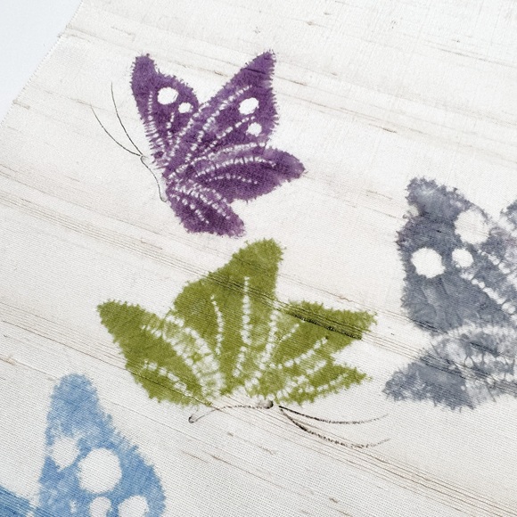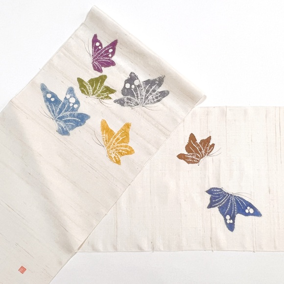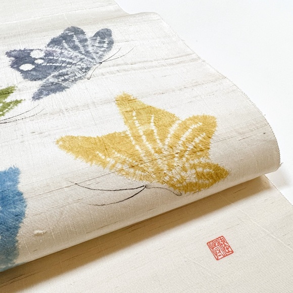 地色は落ち着いた生成り地の真綿紬で、墨描き(カチン)と絞りで表現された蝶文様は、工芸キモノ野口ならではの配色で表現された、躍動感があり美しい名古屋帯でございます。
