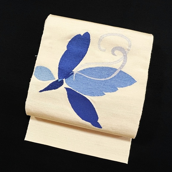 どんな着物にでも合いそうなクリーム地に、瑠璃色と薄群青、銀の濃淡で表された大胆な蝶に心奪われ、弊社に嫁いでいただくことになりました。