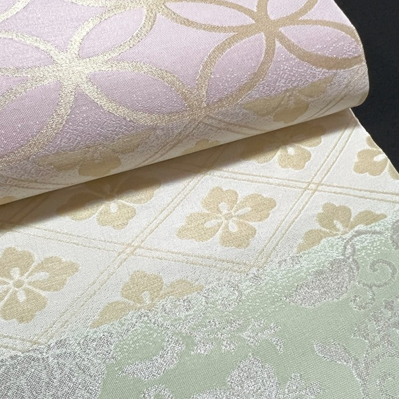 淡い鴇色と鶸色、そして白の配色は品よく洗練された美しさがあり、はんなりとした大人の着こなしに最適です。