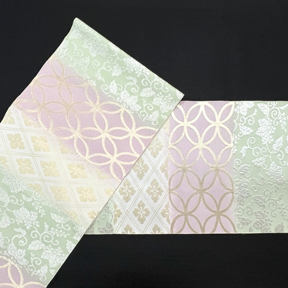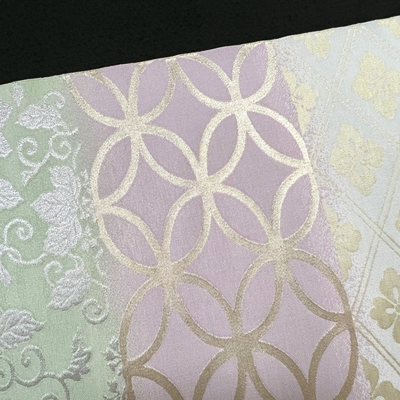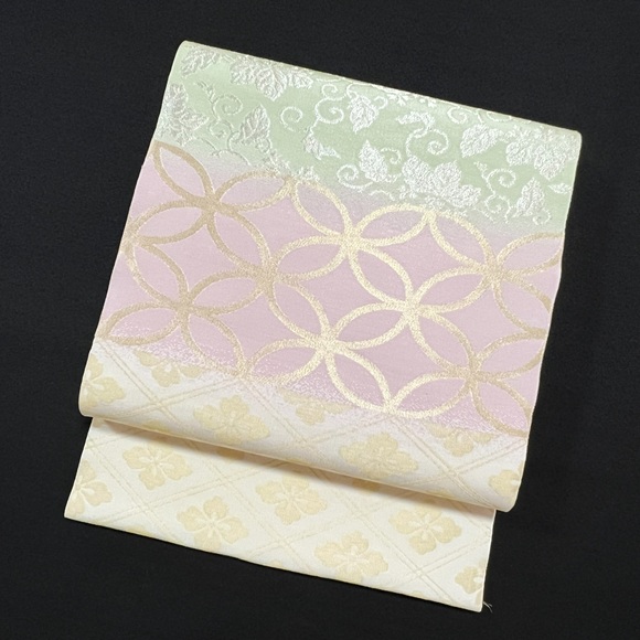 「名物裂集」と名付けられたこの帯は、花菱・七宝・桐唐草と代表的な名物裂の文様を横段に集めた上品な名古屋帯です。