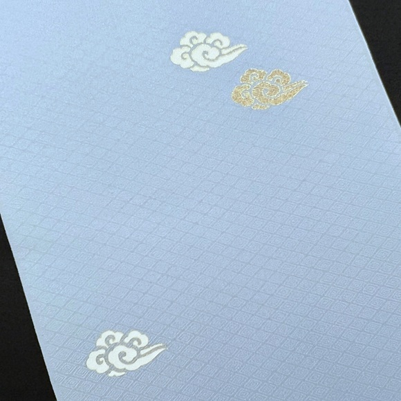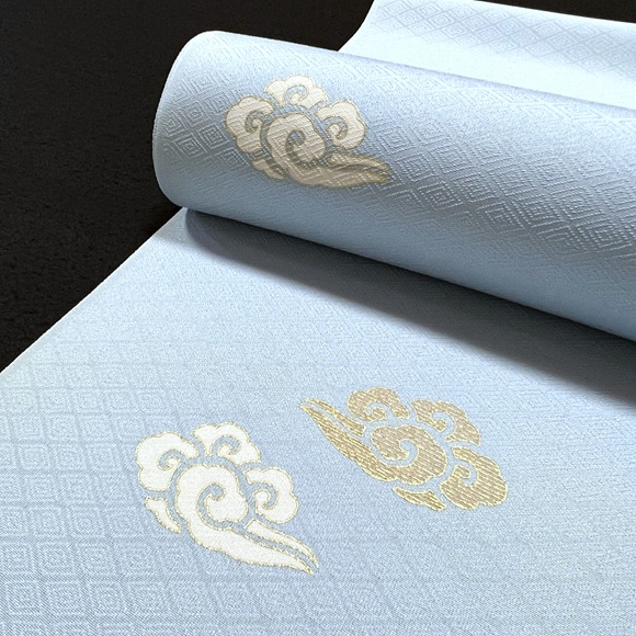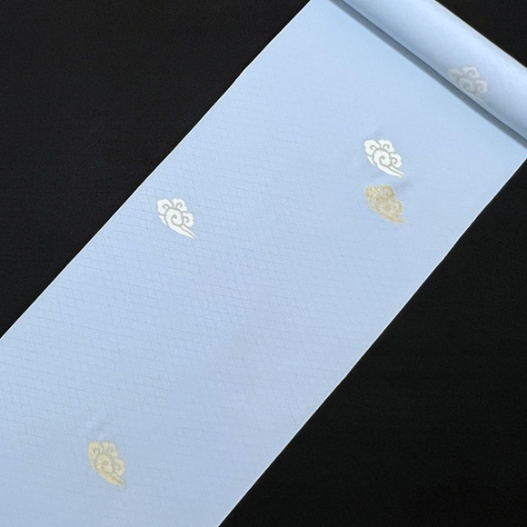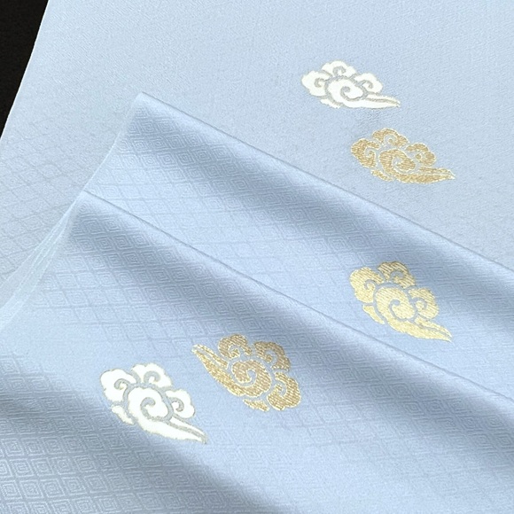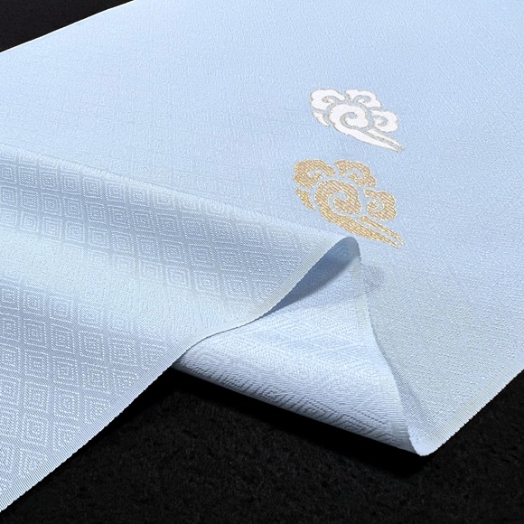 伊と幸の松岡姫で織られた上質な白生地「紋御戸代」を綺麗な空色に染め、瑞雲文様を散らした小紋です。