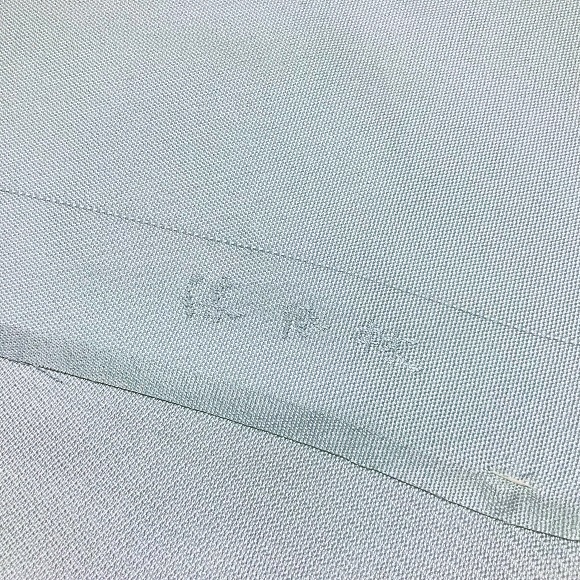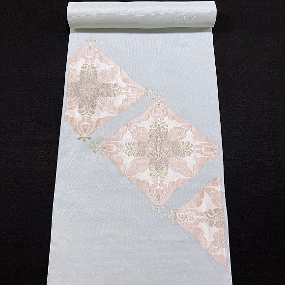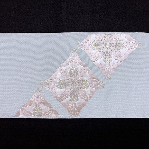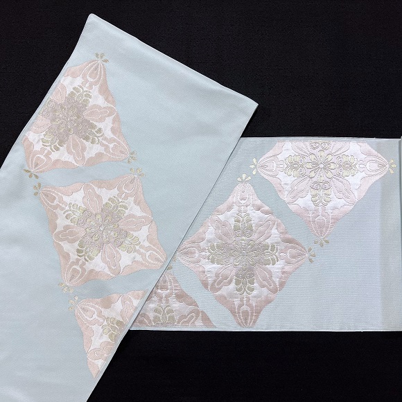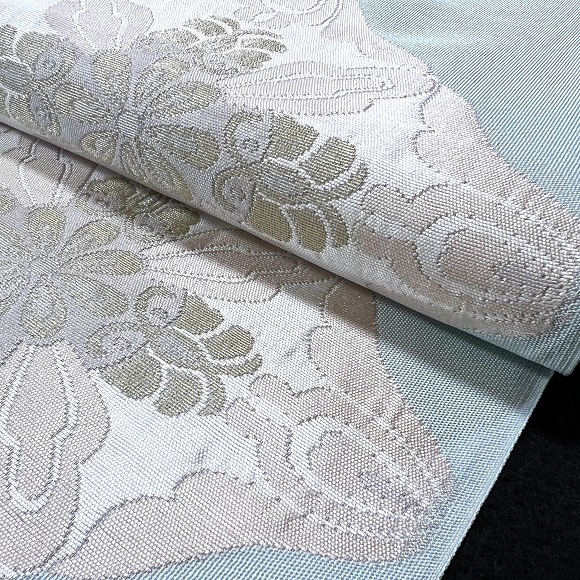水縹色の柔らかで艶のある手織り地に、お太鼓と腹の柄部分はふくれ織で臥蝶華文を斜めに配した極上の逸品です。