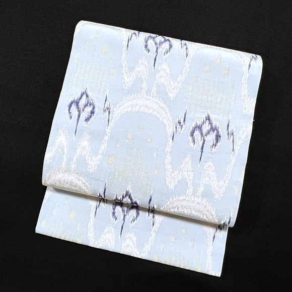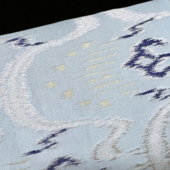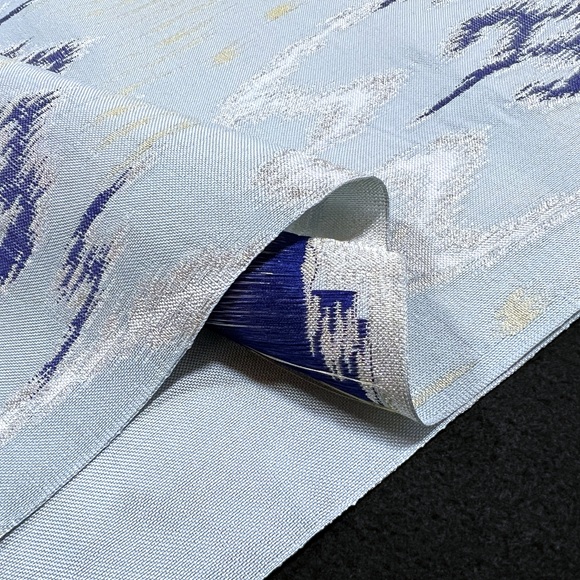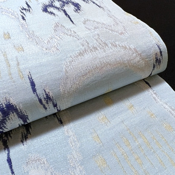水縹地に銀藍金で表現されたこの名古屋帯は、品よく洗練された美しさがあり、落ち着いた大人の着こなしに最適です。
