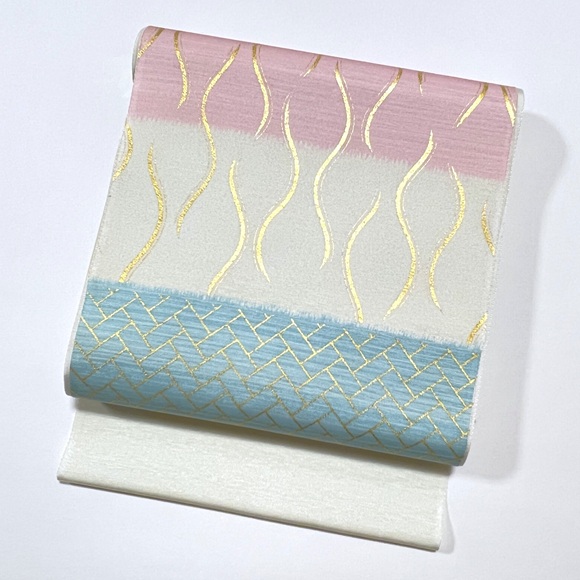 愛らしい桃色と爽やかな青色の横段暈しの上に立涌文様と桧垣文様を金彩で表しております。